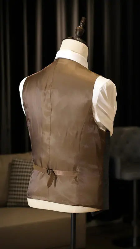 Jakken lukkes med én knap og har dobbelt slids bagpå for optimal bevægelsesfrihed. Indersiden er foret med sort foring og et luksuriøst guldfarvet mønster. Vesten har seks knapper i lyse og mørkebrune nuancer, det samme ternede stof på fronten og en markant mørk gylden bagside – perfekt, når jakken bæres åben eller er taget af.