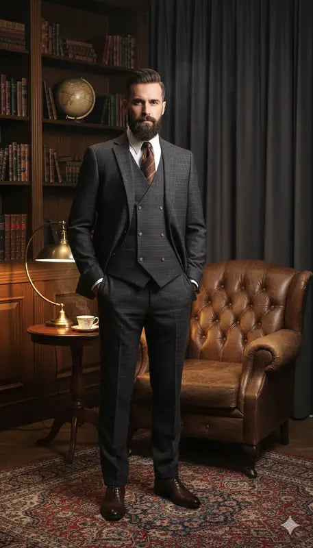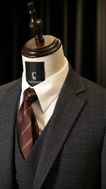 CASTLESON Phantom jakkesættet i grå er et sofistikeret tredelt jakkesæt fra den nyeste kollektion. Det grå stof er dekoreret med et subtilt hvidt/blåt ternet mønster, som går igen i både jakke, dobbeltknappet vest og bukser. En moderne klassiker med sans for detaljer og finish.