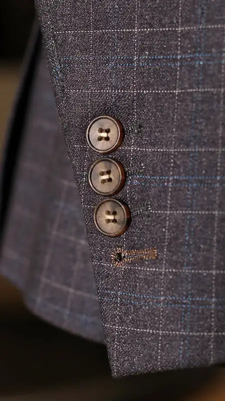 Kavajen og bukserne er lavet i et elegant gråt stof med et raffineret hvidt/blåt ternet mønster. Jakken lukkes med én knap og har dobbelte slidser bagpå, hvilket giver ekstra bevægelsesfrihed og en komfortabel pasform. Kombinationen gør sættet ideelt til både formelle og festlige lejligheder.