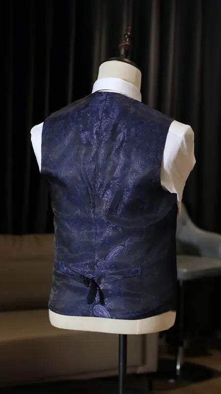 Vesten er det mest iøjnefaldende element i denne udgave. Den sorte, glansfulde front fremhæves af et luksuriøst mønster med lilla og blå detaljer. Dette mønster går igen på vestens inderside og skaber en eksklusiv finish. Den enkeltradede opbygning med fem knapper giver sættet et moderne og elegant udtryk.