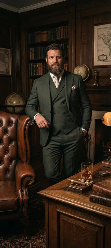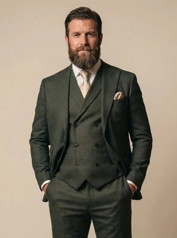 Dette smukke sæt fra TAVERNY, herresættet Salute Army Green. Det er et tre-delt sæt i farven Army Green. Sættet er lavet af højkvalitetsstof. Det er fyldt med smukke detaljer som fløjlsoverflade over lommerne, en smuk iøjnefaldende foring indvendigt og den dobbeltradede vest.