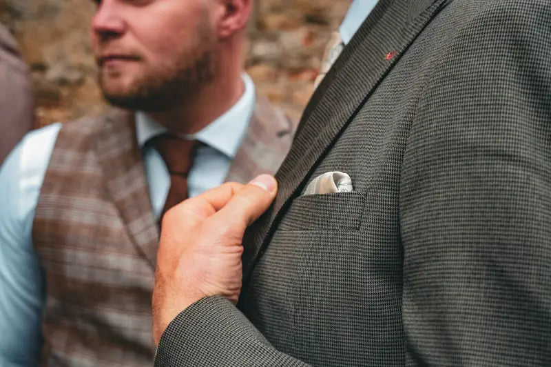 Bemærkelsesværdige detaljer ved dette sæt er de foldede revers på vesten og de forskellige farveknapper. Derudover, hvis du ser nøje, vil du bemærke, at hver nederste knaphul har en anden farve, hvilket gør sættet endnu mere specielt.