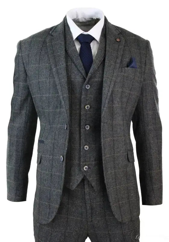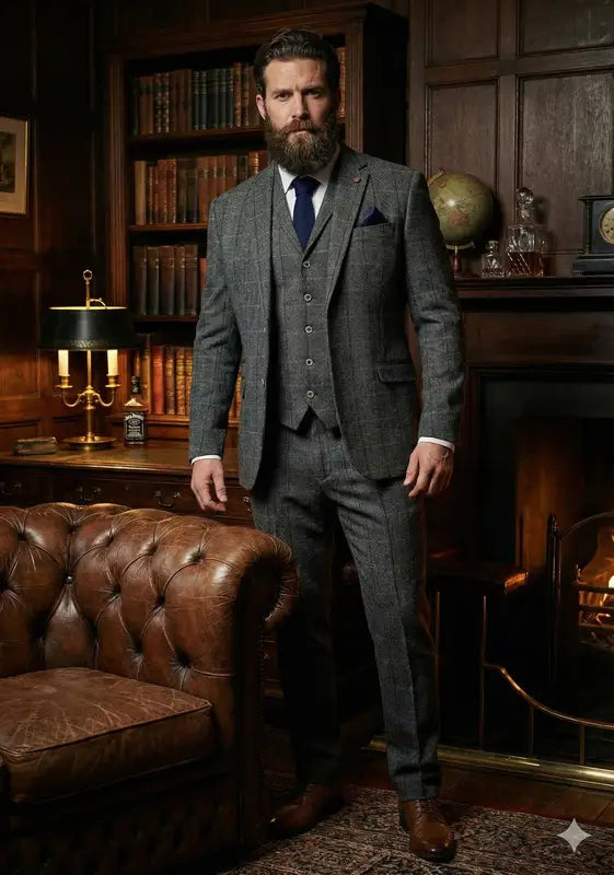 Et tweed jakkesæt med ternet mønster, komplet med jakke, vest og bukser, i en tekstur med kontrastfarvet kant. Det har en skræddersyet pasform (mellem slim fit og regular fit). Et fremragende valg til formelle anledninger som bryllupper, dimissioner og andre festlige begivenheder. Dette jakkesæt giver et klassisk udseende!